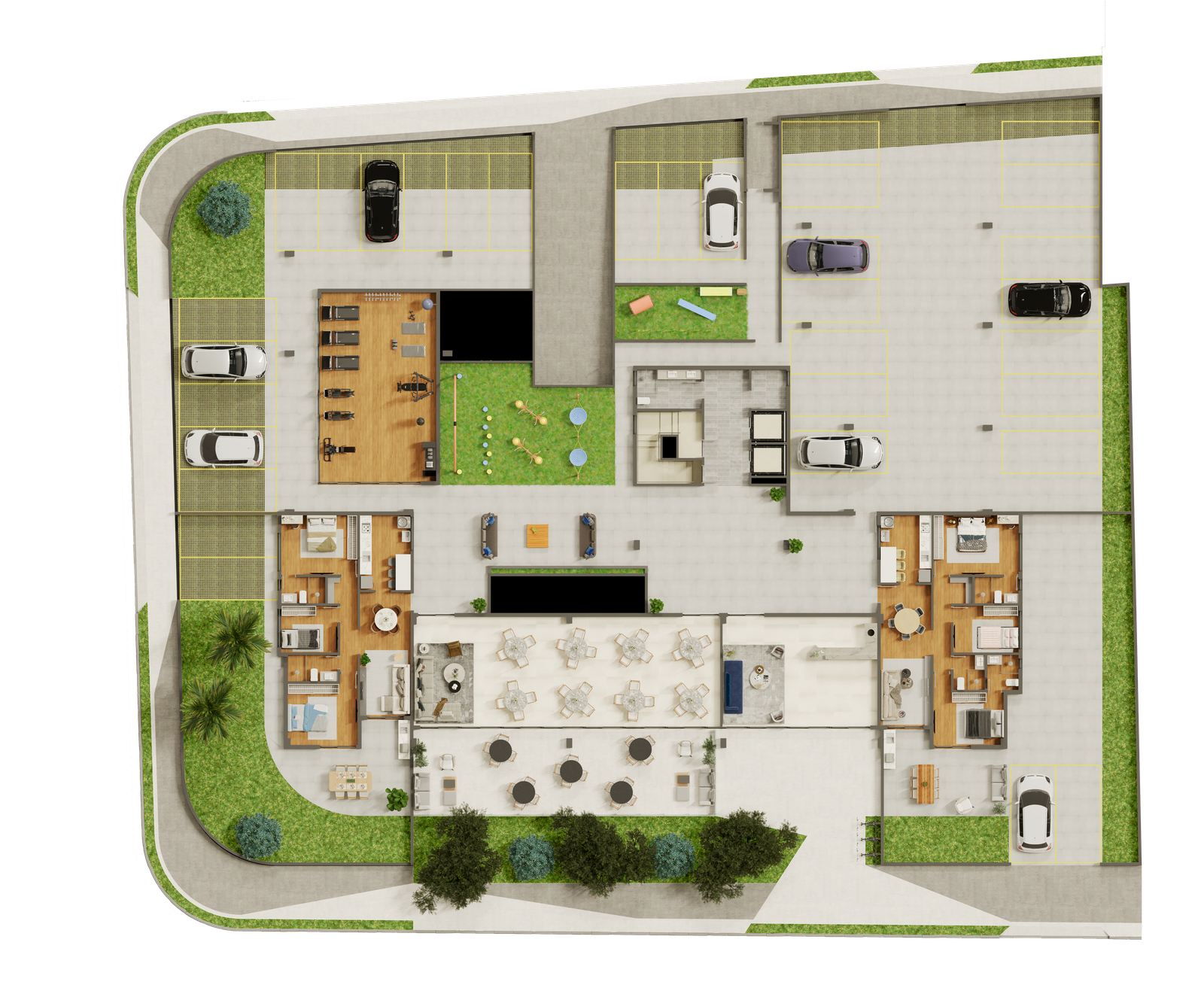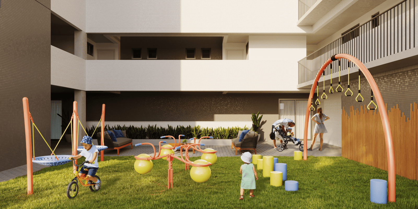 As áreas comuns incluem piscina, academia, espaço gourmet, salão de festas, brinquedoteca, playground e bicicletário, tudo em um ambiente seguro, moderno e cuidadosamente planejado.